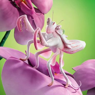 Diese zart gefärbte Handpuppe einer Orchideenmantis vereint Eleganz und Exotik. Mit ihren außerirdisch wirkenden Augen und dem rosa-weißen Körper im Look einer Orchideenblüte zieht sie alle Blicke auf sich